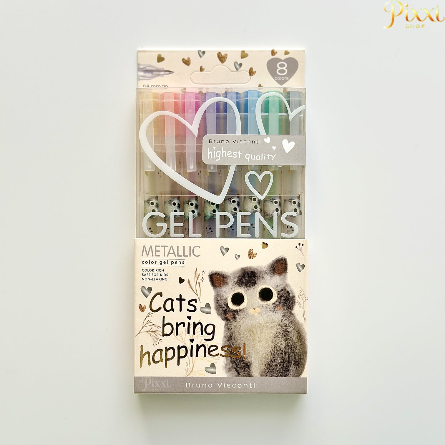 Renkli dünyanıza eşlik edecek eğlenceli ve parlak bir kalem seti minikler (ve içindeki çocukla barışık yetişkinler) için harika bir seçenek! Bruno Visconti'nin sevimli kedi temalı bu 8’li metalik jel kalem seti, canlı renkleri ve yumuşak yazımıyla dikkat çekiyor. Her biri 0.8 mm uç kalınlığına sahip bu kalemlerle hem yazı hem çizimlerde renk patlaması yaşayacaksınız.