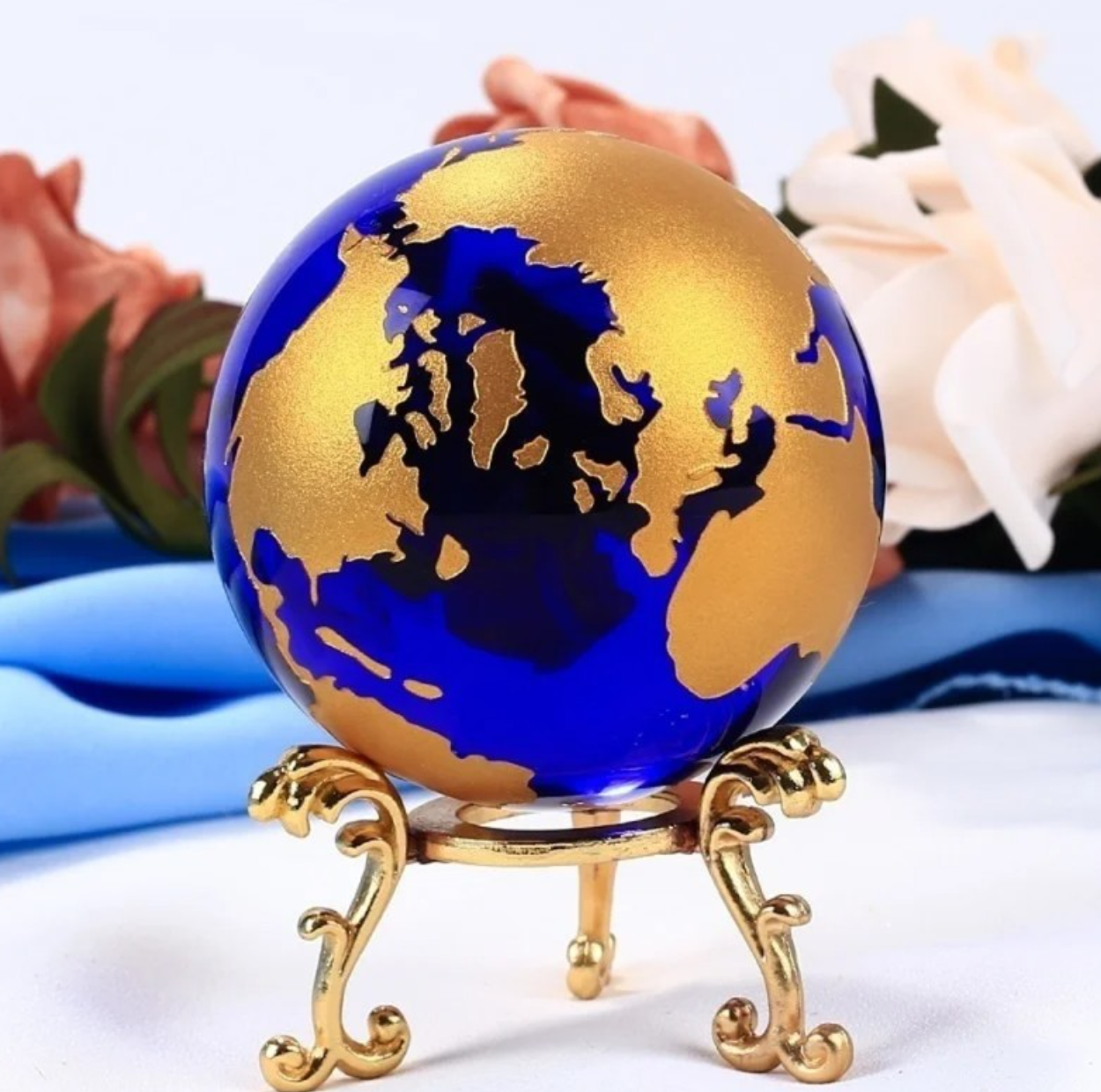 Renkli cam dünya küresi, altındaki gold renkli stand ile şık ve lüks bir görüntü sunmaktadır. Mavi ve altın renklerinin zarif birleşimi ile dikkat çeker. Hem ofis masalarınızda hem de ev dekorasyonunda kullanabileceğiniz bu dekoratif dünya, estetik bir dokunuş ekler. Kaliteli cam malzemeden üretilen küre, şık metal standı ile daha da göz alıcı bir hale gelir.