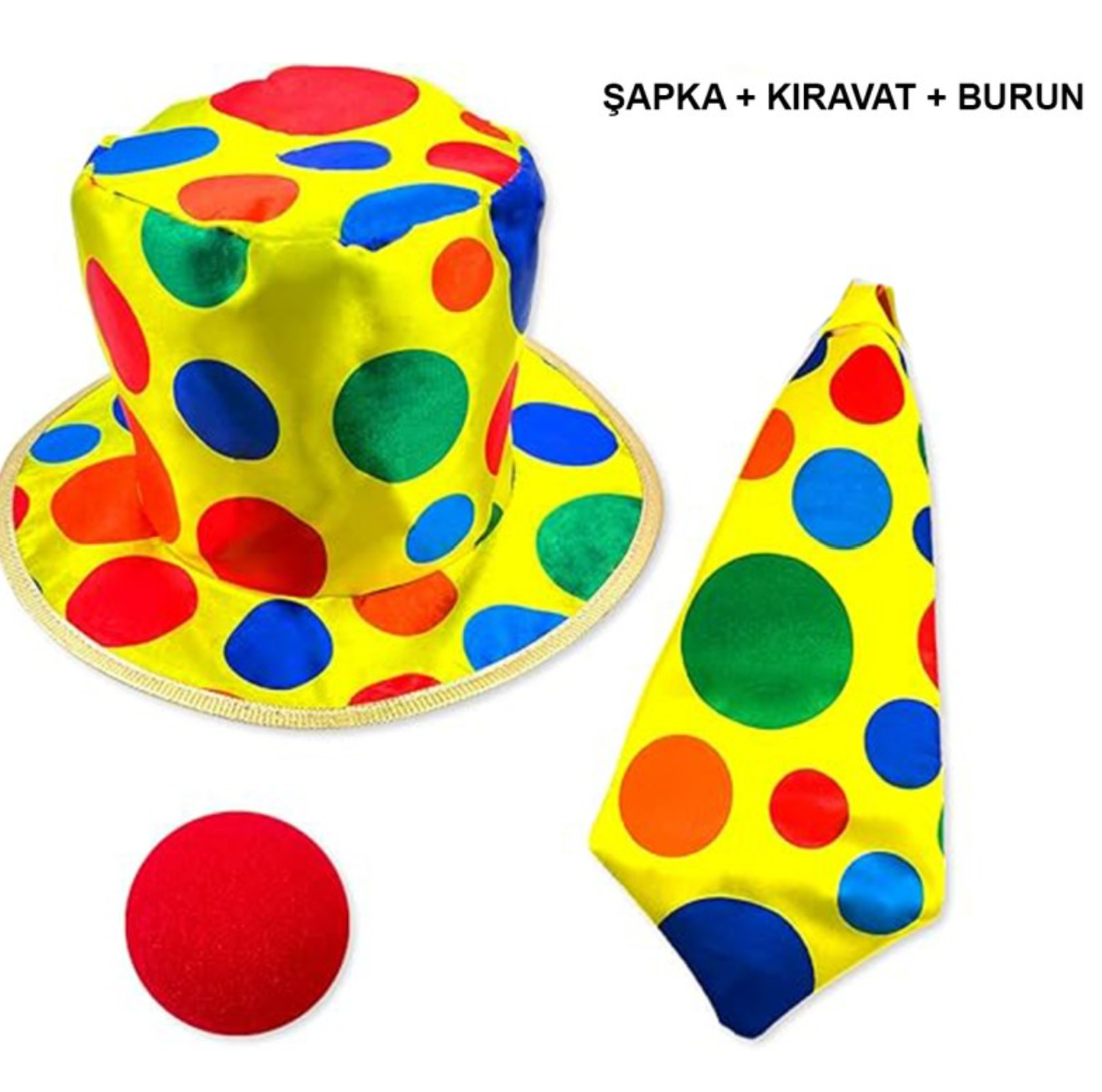 1 Adet Renkli Palyaço Kostüm Seti – Şapka, Kravat, Burun